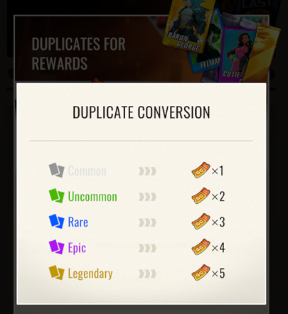 A card you already own is marked with the corresponding icon in the lower right corner. If you get a duplicate, you are granted a ticket that can be exchanged for a reward of equal value.