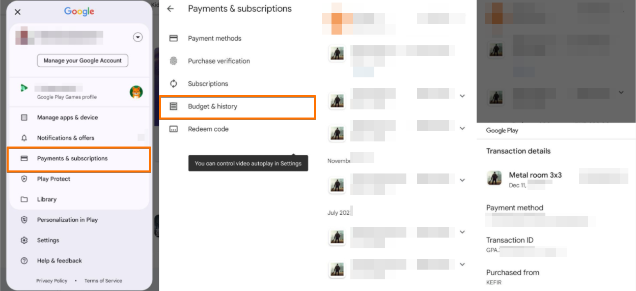 En Android, puedes ver tu pedido en Google Play: Pagos y suscripciones - Presupuesto e historial. Incluye los detalles de la transacción en tu solicitud de ayuda para agilizar el proceso.